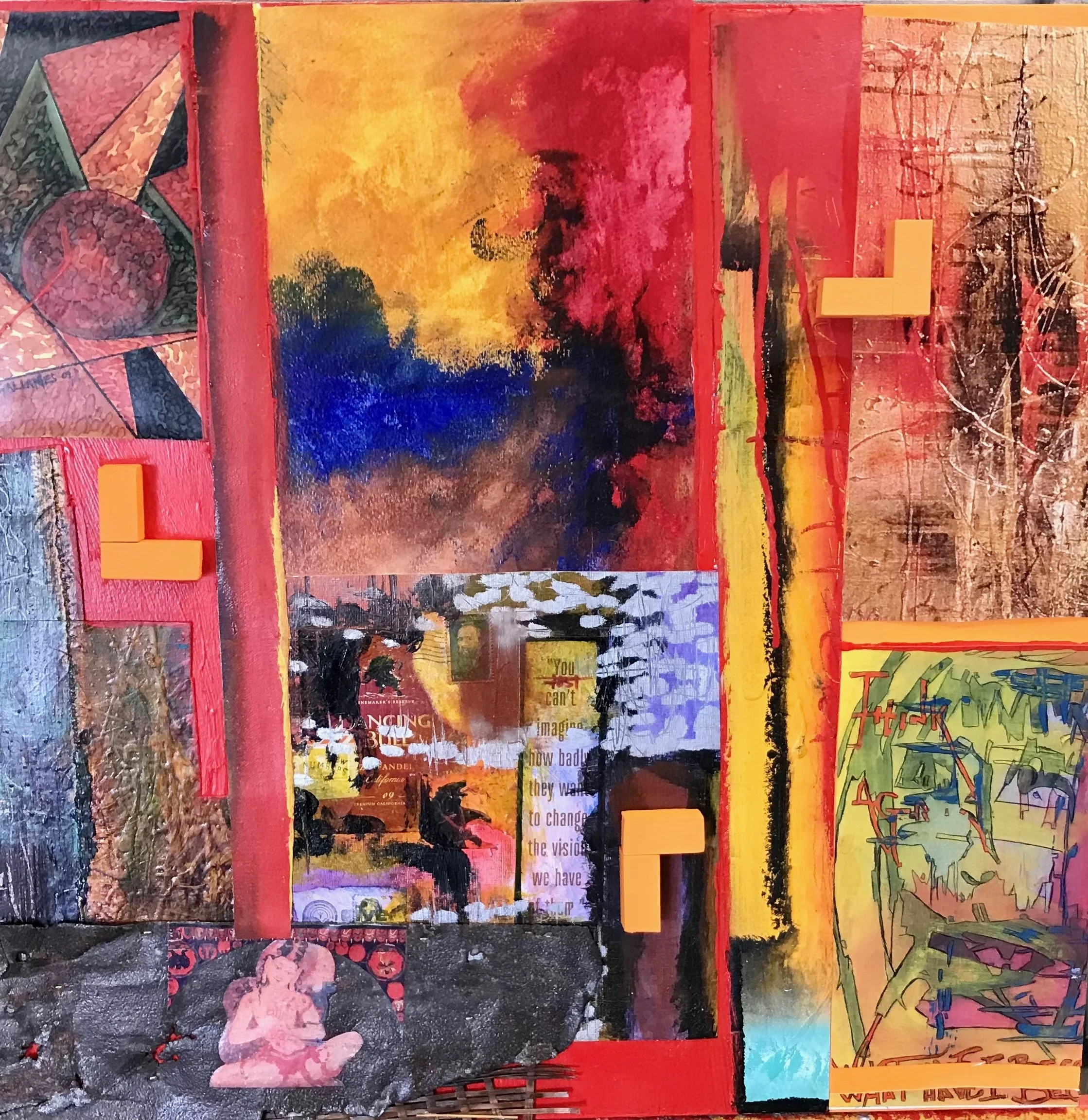 The Voyager is a new painting, that is a collage of some of my old paintings, cut up and implemented on a new canvas and the painted again. A process I enjoy creating!